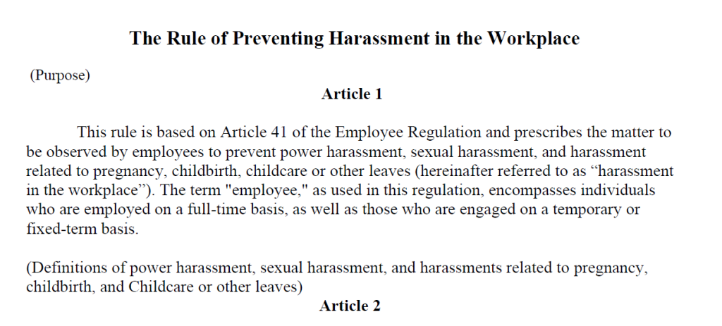 ・「職場におけるハラスメントの防止に関する規定/The Rule of Preventing Harassment in the Workplace」(令和4年4月現在労働施策総合推進法に対応)